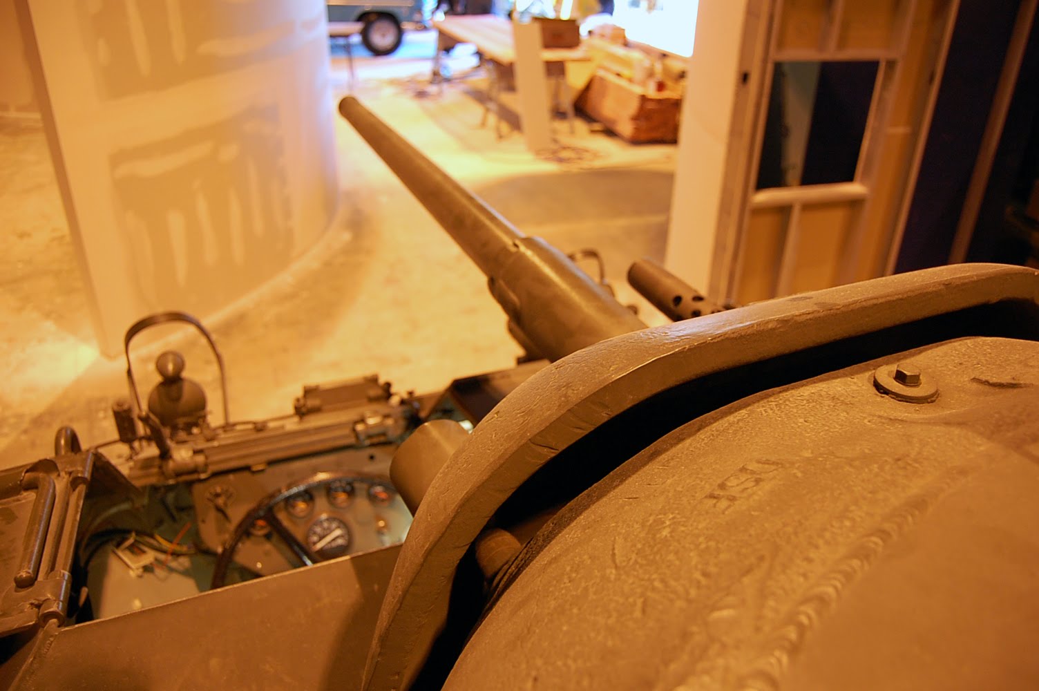 Shells for the main 37 mm gun are stored on racks inside the turret. The barrel of an M1 carbine, carried for personal defense, is visible at left.The vehicle carried 80 37 mm rounds when fitted with a single radio. Vehicles with a second radio installed carried as few as 16 main gun rounds, although unit-level modifications could raise this as high as 40 or more.